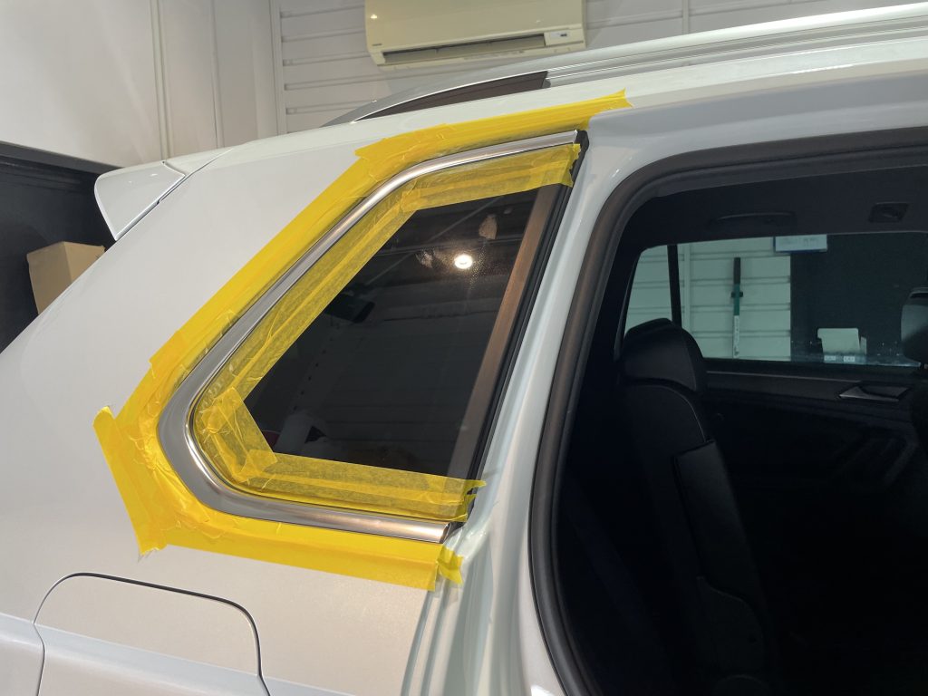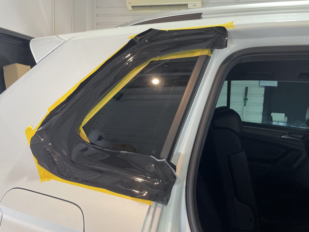 クォーターガラスモールの形状に合わせ、幅に少し余裕を持たせてフィルムをカットし、施工していきます。