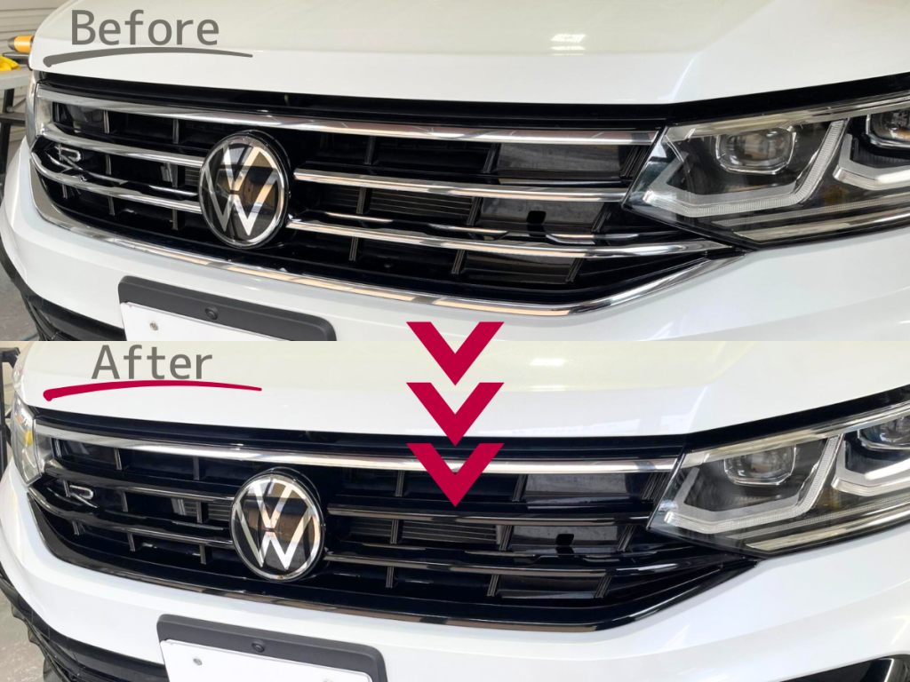 フロントグリルのラッピングでは、お客様のご要望で「一番上のメッキパーツはあえて残してほしい」とのご用命をいただいておりました。