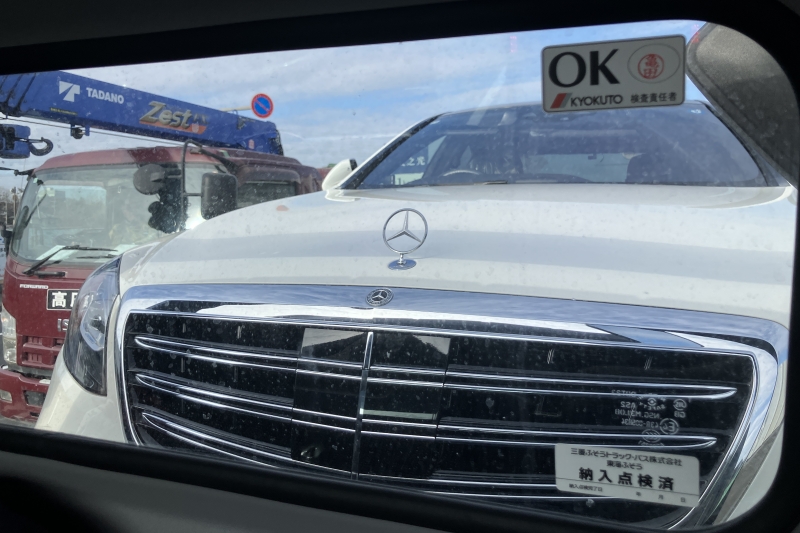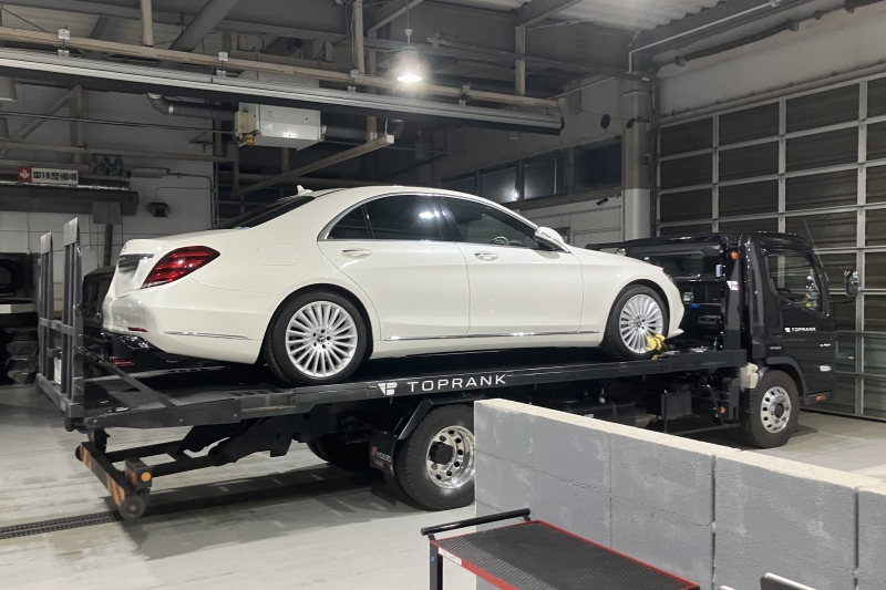 お車は前夜にしっかり固定しておりましたので、長距離でも緩みなく積載車の上で揺られた「S450」