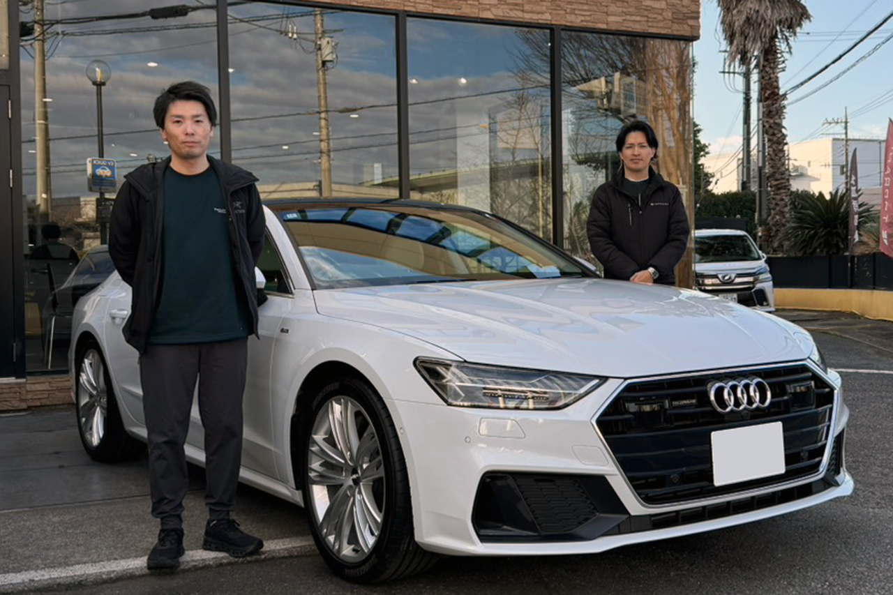 A7スポーツバックのような4ドアクーペをお好みのY様に、各メーカーのモデルを比較検討いただき、最終的にこちらのA7スポーツバックをお選びいただきました。